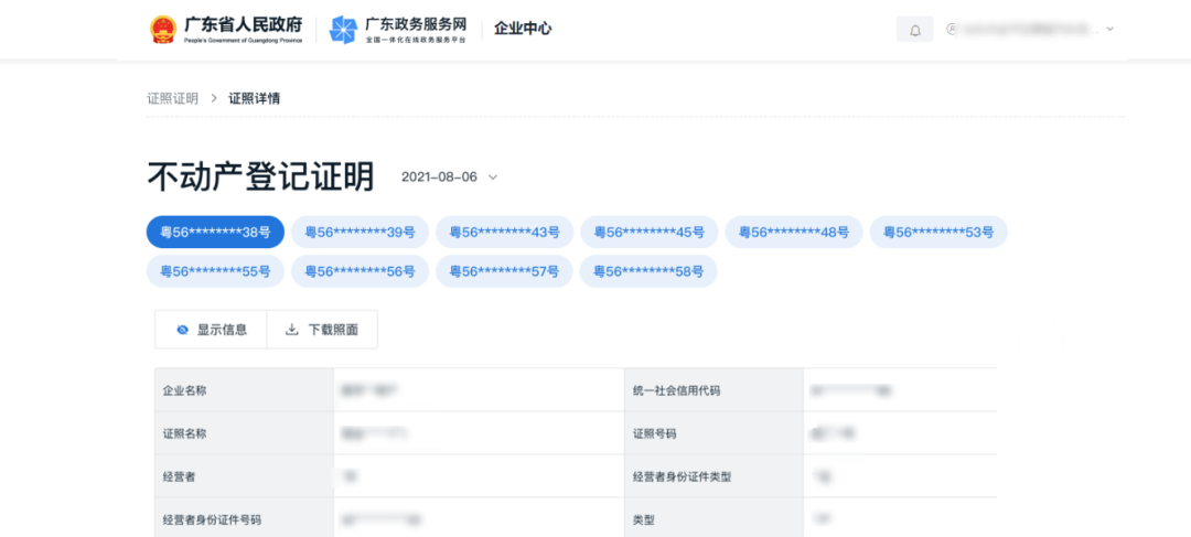 扫码身份核验通过后,系统自动加载当前所登录企业的所有证件资料。点击证照卡片即可进入该证照的详情页,查看详细内容。