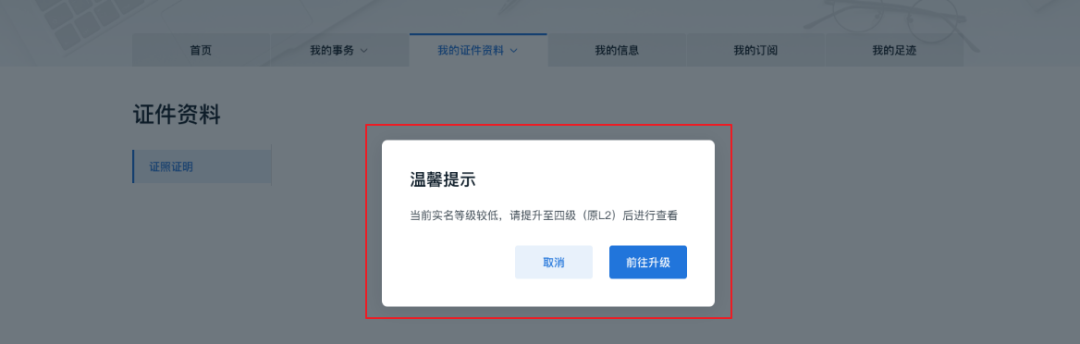(如当前所登录账号未做实名认证,则系统会弹出升级提示,待完成账号实名升级后才可查看到证件资料)